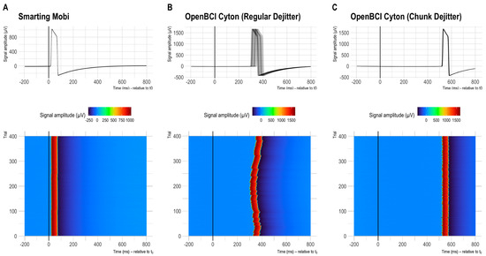 It is important to note the inherent presence of a slight jitter in the sample time stamps as the timestamping itself usually does not happen exactly in regular intervals but on a somewhat random schedule (dictated by the perils of the hardware, drivers, and operating systems). To remove this jitter, the XDF file importer (e.g., the Python interface pyxdf which we used here—https://github.com/xdf-modules/pyxdf, accessed 10 June 2021) uses a robust linear interpolation method (i.e., adjusting the timestamps with a linear model fit in signal segments without gaps). This approach performed as expected for all recordings with single packet transmission (all Smarting Mobi recordings and the OpenBCI recordings in Configuration 3 with 1 ms FTDI buffer settings). In contrast, the observed trial latencies for the default OpenBCI recordings (with 16 ms FTDI buffer—Configuration 1 and 2) showed a highly erratic pattern. These observations led us to further investigate the suitability of alternative dejittering approaches for the OpenBCI data.