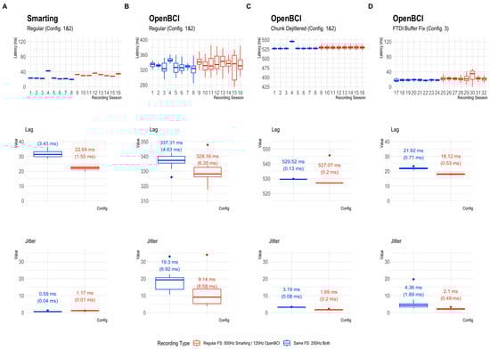 Latency distribution boxplots. (A): Smarting Mobi recordings. (B–D): OpenBCI Cyton+Daisy recordings in configurations 1–3. Note the different levels of the y-Axis scales. The y-Axis range is consistent (showing 150 ms) but the range is different for plots (B,C), indicating a higher overall latency in the OpenBCI recordings with the default 16 ms FTDI buffer setting. The second and third row show the corresponding lag and jitter statistics for the different configurations. The values on the boxplots show median values and IQRs as robust distribution summaries.