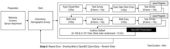In the first experimental stage, for the frequency-domain features, the Alpha band power differences between eyes-closed and eyes-open resting phases were compared (the Berger effect [10]). In these phases, participants were asked to sit still in front of a PC for 120 s with closed eyes or watching a light grey fixation cross on a dark grey screen. The magnitude of the band power differences is hereby considered the first measure of signal-to-noise ratio (SNR) for each amplifier. Similarly, Theta and Alpha band power differences were compared between low and high mental workload phases (again, for 120 s per phase—for a previous observation of the effect see [12,14]). For the induction of these workload levels, participants were asked to mentally sum a series of numbers. These additive equations were shown in a very simple form in the low workload condition (either “101 + 1 = ?”, “101 + 2 = ?”, or “101 + 3 = ?”), or in a hard form in the high workload condition (at least three double digit-summands, e.g., “68 + 71 + 31 = ?”). To ensure that the task was perceived as hard, the difficulty in the high workload condition was dynamically increased after each correctly solved trial by adding another summand or turning a single-digit summand into a double-digit summand. Participants had 18 s to complete a trial and enter the result in a field on the screen via a keyboard. Between each trial, a four second break occurred. The design for this task was chosen similar to the procedures used in studies that demonstrated successful elicitation of different mental workload levels [12,24,25]. Surveys were shown after each of these experimental tasks to assess perceived mental workload (using the NASA Task Load Index—TLX [26]) for a manipulation check.