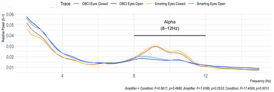 Berger effect replication. The elevated power in the Alpha frequency range (8–12 Hz) indicates similar effects for both amplifiers.
