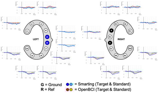 Given this high signal comparability, the final ERP comparison was pursued. To enable higher comparability, a crossed linked reference was computed (i.e., L6+R5 for the Smarting Mobi, and L5+R6 for the OpenBCI Cyton). Next, all trials per condition (standard and target) were averaged. Figure 18 shows the ERP traces aligned with the cEEGrid electrodes.