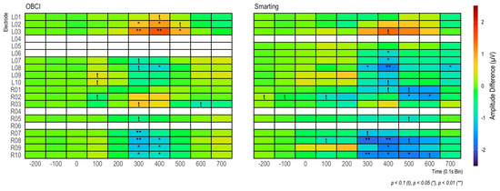 Furthermore, in both cases (grand average and individual participants) very similar amplitudes are observed for both amplifiers. Thus, from a qualitative view, we consider these ERP components to show high comparability of the two amplifiers in terms of SNR. To further assess the effect strength of the P300 component, amplitude differences between target and standard condition were calculated for 100 ms windows (see Figure 14). The condition effects are most pronounced between 300 and 500 ms and maximal at channels L8, L9, R8, and R9, with a much weaker, positive reflection of the same effect in the electrodes L2, L3, R2, and R3. To ascertain the significance of these differences for the entire sample, paired t-tests were calculated for each bin (see Figure 14). Both the heatmap and the statistical tests further support the observation of similar SNR across the amplifiers with the clearest effects for the evoked potential in the lower electrodes (L8 and L9/R8 and R9) in the 300 to 500 ms time range.