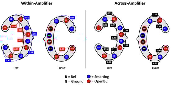 The main motivation for this final study was the frequent presence of recording artefacts in the first user study and the general limitation from that repeated measures design that the observed signals might be subject to various behavioral and cognitive confounding factors (fatigue, boredom, or discomfort, just to name a few possible influences that might set in during the second repetition of the experiment). Therefore, to overcome these limitations and get a clear picture of the recording quality comparability of the two amplifiers with cEEGrids, a recording was conducted that concurrently used both amplifiers with a subset of the cEEGrid electrodes on each amplifier (as pairs with maximum proximity). Thereby, it was possible to measure a shared neural signal ground truth (similar to the timing test and similar to a previous OpenBCI comparison study [32]).