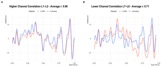 Signals on two adjacent electrodes (Smarting Mobi = Blue, OpenBCI Cyton = Red) in a highly correlated pair (A) and a less correlated pair (B).