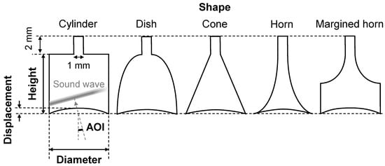 Figure 2 shows five geometric parameters: shape, height, diameter, displacement, and angle of incidence (AOI). First, five shapes, namely, cylinder, dish, cone, horn, and margined horn, are considered. The cylinder is the simplest shape, and the air chamber of our body-conduction microphone has this shape. The cone corresponds to the bell shape mentioned in the introduction. The dish and horn correspond respectively to the shallow bell and trumpet bell mentioned in the introduction. In addition, a margined horn is proposed. This shape consists of a cylindrical margin and a horn. The margin eliminates the effect of the deformation of the intermedium. The horn is adopted because it has a better amplification ratio than the dish [19]. Second, the height is swept from 1 mm to 5 mm to fit the thickness of the collar. Third, the diameter is swept from 1 mm to 15 mm to fit in the width of the collar. Fourth, the deformation is defined using displacement, as depicted in Figure 2. The displacement is swept from 0 mm to 1 mm because the lowest height in the simulation is 1 mm. The amount of displacement relative to the pressing force depends on the shape of the air chamber. Therefore, the relationship between the pressing force and the displacement was calculated through solid mechanics simulations using simulation software (COMSOL Multiphysics, COMSOL Inc., Stockholm, Sweden). The Young’s modulus of the intermedium, which we measured experimentally, was 72 kPa. Fifth, the AOI of scratching sounds also needs to be considered. Scratching sounds generated at the scratching point, where the skin and finger come into contact, propagate to the intermedium and are transmitted into the air chamber. The speed of sound in the silicone rubber (the material of the intermedium) is approximately 1000 m/s [20], and in air it is 340 m/s. This difference makes the AOI in the air chamber smaller than that in the intermedium. Specifically, the AOI is limited up to 19° (≈tan−1(1000/340)) in the air chamber. Therefore, we consider the AOI of the sound source to be from 0° to 20° in the simulation. The above parameters and their sweep ranges are described in Table 1.