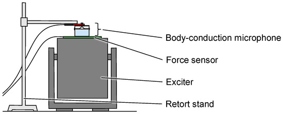 Figure 3 shows the experiment setup. The sine wave is output from the exciter (PM-100, Dynalabs, Ankara, Turkey). A single-frequency sine wave is used in the experiment, allowing for noise removal by filtering. The frequency is set to 300 Hz, this being within the range of scratching sounds. The fabricated body-conduction microphone measures the vibration in contact. A force sensor (FSR406, Interlink Electronics Inc., Camarillo, CA, USA) is inserted between the exciter and the body-conduction microphone to measure the pressing force. The measured sound is logged using a datalogger (DR-7100, Ono Sokki Co., Ltd., Yokohama, Japan) with a sampling frequency of 48 kHz and 16-bit resolution. For each body-conduction microphone, 30 s of sound data are measured. The data are filtered to extract 300 Hz using a band-pass filter (Butterworth, 5th order). The mean square value of the measured signal is calculated. The amplification ratio is then calculated as follows: