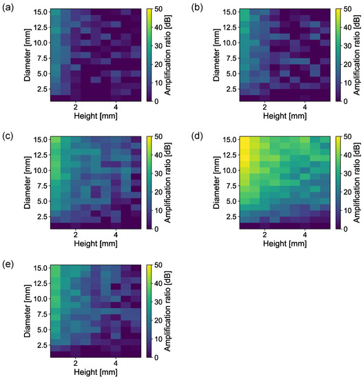 Figure 4 shows the amplification ratios of the cylinder (a), dish (b), cone (c), horn (d), and margined horn (e) shapes with the swept heights and diameters. The displacement and AOI are 0.0 mm and 0°, respectively. The lower height and higher diameter achieve higher amplification ratios for all shapes. The horn shape achieves the highest amplification ratio among the five shapes. In particular, with a height of 1 mm and a diameter of 15 mm, it has the best performance. Conversely, the cylinder and dish shapes achieve the lowest amplification ratios. These results indicate that the diameter-to-volume ratio significantly affects the amplification ratio.