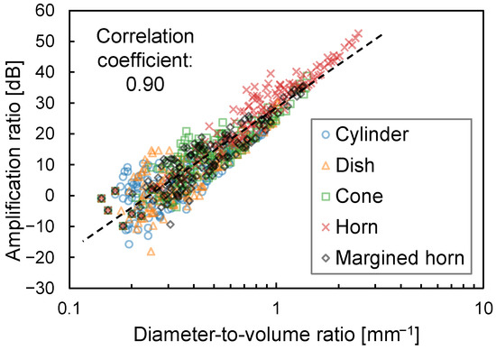 Figure 5 shows the amplification ratios against the diameter-to-volume ratios. The dashed line represents the regression line, and the correlation coefficient is 0.90. This indicates that the amplification ratio is strongly correlated with the diameter-to-volume ratio. Conversely, the distribution has a longitudinal width. In other words, the amplification ratio is volatile even at the same diameter-to-volume ratio.