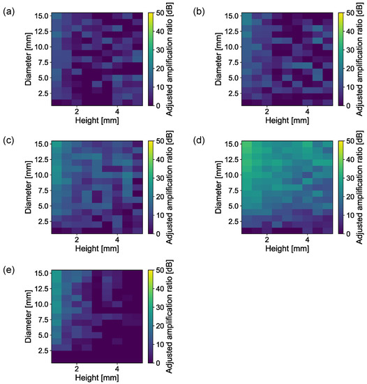 Adjusted amplification ratio against diameter and height. (a) Cylinder. (b) Dish. (c) Cone. (d) Horn. (e) Margined horn.
