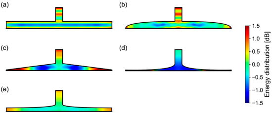 To investigate how the geometric characteristics of the air chamber shape affect its amplification ratio, the energy distributions of the sounds in each air chamber were calculated, and these are shown in Figure 7. The height and diameter were then fixed at 1 mm and 15 mm, respectively. The energy distribution was calculated as a sum of the power for each element during the simulation. The energy distribution of 0.0 dB is defined as the mean of all areas in the air chamber. In this figure, the cylinder and dish shapes have striped patterns, indicating standing waves. We assume that a standing wave indicates that the energy of the sounds stagnates and does not flow into the microphone. For example, most of the sound propagated into the cylinder-shaped air chamber continued to reflect off the upper and lower surfaces of the chamber. Conversely, the other shapes do not have a standing wave. We believe that this is the reason why the horn shape has a higher amplification ratio than the others.