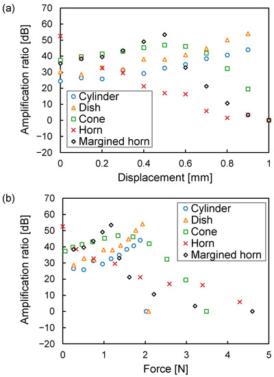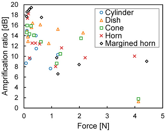 The experiment evaluated the five shapes with a height of 1 mm and a diameter of 15 mm, these parameters having produced the highest amplification ratio in the simulation. The margin of the margined horn shape was 0.5 mm. Figure 11 shows the experimental amplification ratios against the pressing force of the five shapes. The margined horn achieved the highest amplification ratio among the five shapes, and its amplification ratio was 19.4 dB at a pressing force of 0.27 N. The simulated amplification ratio’s peak was 53.4 dB at 1.17 N, as depicted in Figure 8. The experimental amplification ratio was 34.0 dB lower than the simulated one. We believe that there are two reasons for this. The first is the fabrication method of the cover generating the air chamber. The cover was made using a fused deposition modeling-type 3D printer. This type may result in small gaps in the stacking of the material, and the air chamber may not have been completely sealed. The second is the characteristic acoustic impedance of the cover. Changing the material of the cover from PLA to a material with acoustic impedance farther from that of air can reduce the outflow of body-conducted sounds.
