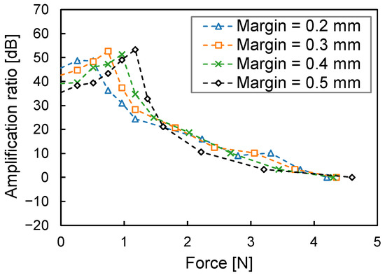 Although the margin has been fixed at half the height of the entire chamber for the margined horn shape, the peak can be shifted to any pressing force by adjusting the margin. For example, Figure 9 shows the relationship between the amplification ratio and the pressing force when the margin ranges from 0.2 mm to 0.5 mm and the whole height is 1 mm. The pressing force depends on the design of our final collar device. The current prototype device requires a pressing force of approximately 1 N, and a margin of 0.4 mm is appropriate and achieves a peak amplification ratio of 51.4 dB. In practice, we can design this margin simultaneously with the entire device.