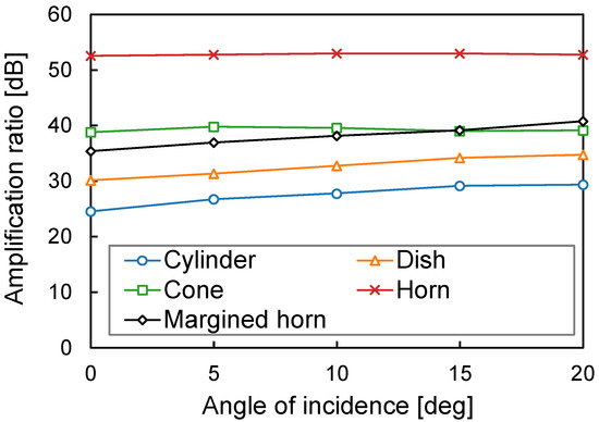 To investigate this volatility, the amplification ratio was adjusted to have the same diameter-to-volume ratio. Specifically, the amplification ratio was multiplied by the reciprocal of the diameter-to-volume ratio. Figure 6 depicts the adjusted amplification ratio. If only the diameter-to-volume ratio affects the amplification ratio, these five graphs can be considered to have the same characteristics. However, the horn shape has a higher amplification ratio than the other shapes, followed by the cone and margined horn shapes. This result indicates that the geometric characteristics of the air chamber shape affects the amplification ratio regardless of the diameter-to-volume ratio.