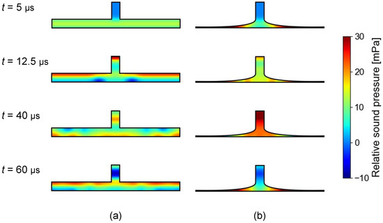 There had previously been no quantitative comparison of the amplification ratios of air chambers with different shapes. This study shows that the horn-shaped air chamber achieves the highest amplification performance, at least for sound frequencies below 2 kHz. There are two reasons for this. The first is that the horn shape has a higher diameter-to-volume ratio, as is depicted in Figure 5. This is reasonable because of the following. The diameter corresponds to the amount of sound energy flowing into the air chamber. Conversely, the volume corresponds to the number of air molecules absorbing the sound energy. Therefore, the diameter-to-volume ratio corresponds to the energy used to vibrate certain air molecules. The second is that it is difficult for standing waves to exist within the horn shape, as is depicted in Figure 7. To explore this further, Figure 12 shows the transient sound propagation in the cylinder-shaped and horn-shaped air chambers. They are visualized as sound pressure distributions relative to the initial condition in which t, representing the time elapsed since the impulse wave was generated, is 5 μs, 12.5 μs, 40 μs, and 60 μs. The two shapes are adjusted to have the same diameter-to-volume ratio. In the cylinder-shaped chamber, high pressure is distributed on the upper surface of the chamber when t = 12.5 μs and 60 μs, and it is distributed on the lower surface when t = 40 μs. These results indicate that most of the sound continues to reflect off the upper and lower surfaces of the chamber and is not flowing into the microphone. Conversely, in the horn-shaped chamber, high pressure is distributed on both sides of the air chamber when t = 5 μs and 60 μs, and it is distributed near the center of the chamber, including the microphone, when t = 40 μs. These results indicate that most of the sound circulates well in the air chamber and is not stagnant. In summary, a horn-shaped air chamber should be adopted when fabricating a body-conduction microphone, including a stethoscope with a higher amplification ratio.