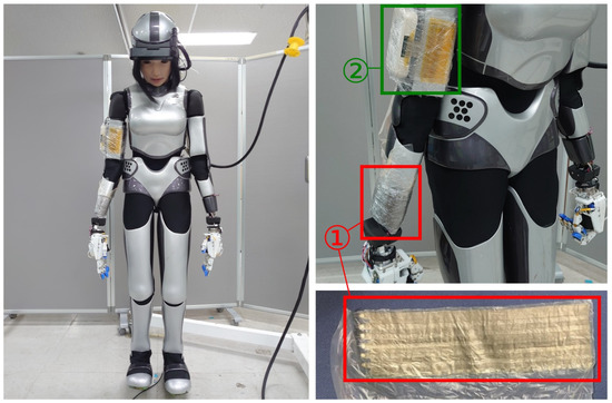 Photographs of HRP-4C humanoid robot with the flexible tactile sensor mounted on its right wrist and flattened sensing array: (1) flexible sensing array; (2) acquisition module sending data through Bluetooth.