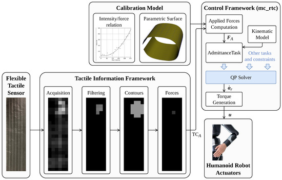 A software framework has been developed to handle the information from the tactile sensor to be able to use it in our robot controllers. This tactile information framework is designed as a package for the Robot Operating System (ROS), melodic version [33]. It acquires the data from the sensor using Bluetooth Serial Port Profile (SPP), then applies different computations to obtain the forces applied to the normal to the cells, and finally sends them as a control input to our robot controller based on mc_rtc (version 1.14), an interface for simulation and robot control systems [34]. An overview of the whole process with the tactile information framework and the control framework is given in Figure 2.