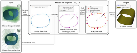 The process to construct the B-spline is an iterative process for all planes . The details of the process are given in Algorithm 1. It first computes the intersection between the mesh and the plane . This intersection is a curve formed by a set of ordered points (non-parametric). As these points are not evenly separated, the algorithm then computes the intersection between this curve and all the planes along v direction. This results in a similar curve but with all the separation points lying on the planes along v direction . The obtained curve is projected to a 2D space and then approximated with a B-spline curve using constrained NLLS. Commonly, NLLS algorithms use the set of points to find the optimal control points that define the B-spline curve [44], i.e., solving the following optimization problem: