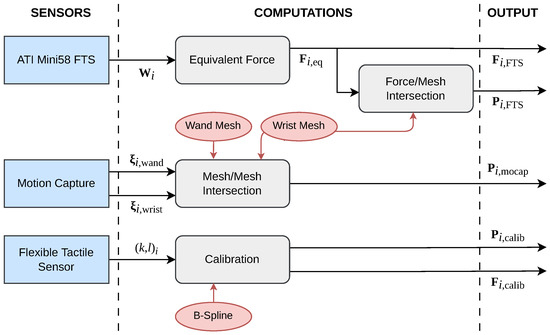 The data from the FTS, the tactile sensor, and the motion capture are captured through ROS and are used to compute the force vectors applied to the tactile sensor and the contact points, as shown in the flowchart in Figure 4. The computations are implemented in Python under a ROS package and are detailed in the following paragraphs. As there is a finite number of touches performed during the experiment, we will denote as the index of the touch.