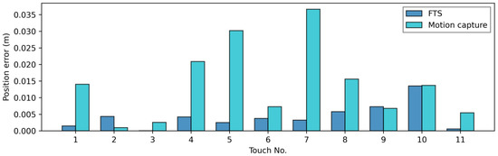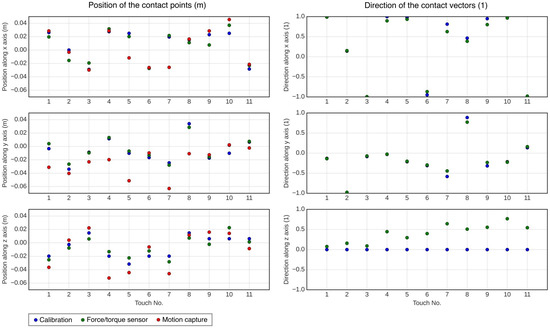 We made the hypothesis that the error is caused by an abnormal value of the force along z given by the FTS. A possible explanation of this phenomenon is that the FTS we use has a lower resolution on the z axis than on the x and y axes: for the configuration, we used (SI-1400-60), and the force sensing resolution was 7–12 N for the z axis and 1–3 N on x and y [50]. This lower precision, combined with the high sensing range of the sensor, could lead to unstable results if the force applied is too low, as was the case when the FTS was touched with the wand (applied forces were between 1 and 16 N along the z axis, with a mean of 3.6 N). Less probable, this error might result from a wrong force calibration of the FTS along z. The use of a second sensing method—in our case the motion capture—aims to verify the coherence between the results obtained and to validate, or not, the hypothesis made on the FTS. This will be discussed in the next section.