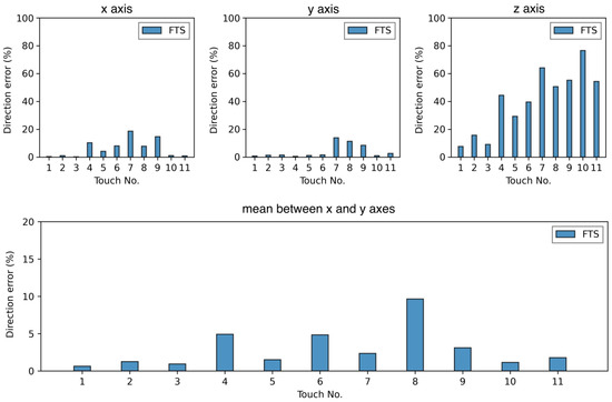 Firstly, we compared the normals to the cells given by the calibration method and those obtained from the FTS. Figure 7 shows the absolute values of the difference between the vector directions for x, y and z axes, computed directly from the data of Table S1. We observed that the mean error on the z axis that almost coincides with the main axis L after transformation to the experiment frame is high for each touch, with a mean of .