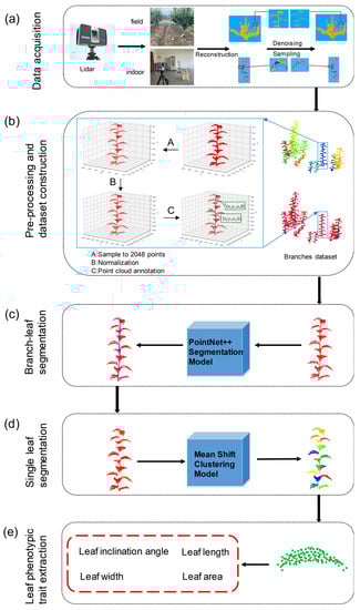 Workflow of this study: (a) Data acquisition; (b) Data pre-processing and branch level dataset construction; (c) Branch–leaf segmentation with PointNet++ segmentation model; (d) Single leaf segmentation with Mean Shift Clustering Model; (e) Leaf phenotypic trait extraction.