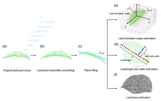 Based on the single leaf point cloud, four phenotypic parameters, including leaf inclination angle, leaf length, leaf width, and leaf area, were estimated, as shown in Figure 1e and Figure 3. When using multi-station lidar scan for registering, the leaf surface in point cloud may not be smooth due to wind and registration errors, which has a significant impact on leaf surface reconstruction in the later stage. Therefore, the Moving Least Squares (MLS) method [40] was employed to resample the point clouds (i.e., smoothing) before parameter estimation, as shown in Figure 3b.