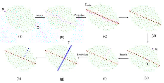 Based on the morphology of pear tree leaves and the leaf point cloud, it can be estimated that the two points with the furthest distance from the leaf point cloud are the leaf base point P and the leaf tip point Q (Figure 4a). Using these two points, the K-nearest neighbor algorithm was employed to approximate the midrib. The algorithm involves the following steps:
