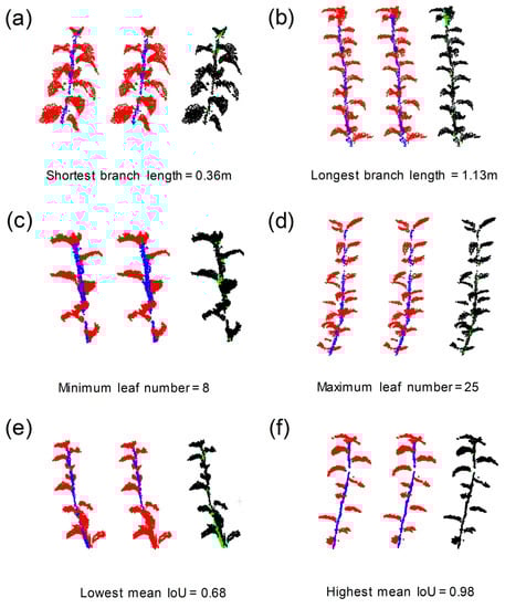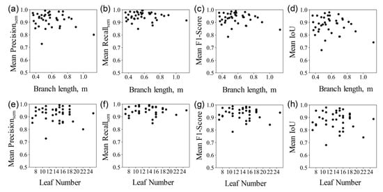 The point clouds of 45 branch samples in the test dataset were segmented into branches and leaves, and the results were visually and quantitatively evaluated. Figure 5 shows the results of semantic segmentation of branches and leaves with different attributes, i.e., branch length and number of leaves, and the mean IoU of branch and leaf segmentation.