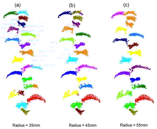 Based on the results of branch–leaf segmentation, we performed single leaf segmentation for leaf point clouds using mean shift clustering with different radii. From the examples presented in Figure 7, we found that after separating the branches and leaves in the previous step, most leaves could be segmented into single leaves through mean shift clustering. However, some small leaves with missing parts caused over-segmentation. When the radius was too small, one leaf was mistakenly divided into multiple leaves, as shown in Figure 7a. Conversely, when the radius was too large, two or more leaves were grouped into a single leaf. This problem was more obvious where there were leaves at the top of the branch, which were very small and close to each other, as shown in Figure 7c. We found that setting the radius to 45 mm (as shown in Figure 7b) achieved a more balanced segmentation effect.
