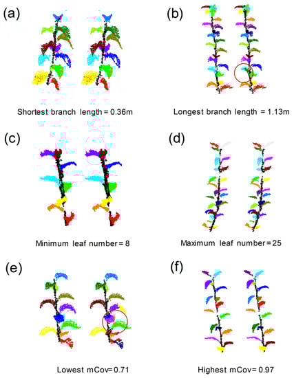 To evaluate the segmentation effect, the instance-level precision (Precisionins), instance-level recall (Recallins) and mean coverage (mCov) with different clustering radii were quantitatively evaluated. The segmentation results corresponding to different radii are shown in Table 4. The results show that, using the radius of 45 mm for mean shift clustering could better segment single leaves of pear tree branches. The single leaf segmentation of branches in the test dataset with different attributes (branch length and number of leaves) and mCov are shown in Figure 8. The results show that leaves can be separated from each other effectively with the given radius. However, some large leaves were mistakenly divided into two, as seen in Figure 8b,e.