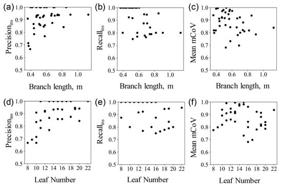 Distribution of the single leaf segmentation evaluation metrics with branch length and number of leaves. Each subfigure shows Precisionins, Recallins, and mean mCov of each sample with different branch length (subfigures (a–c)) and leaf number (subfigures (d–f)), respectively.