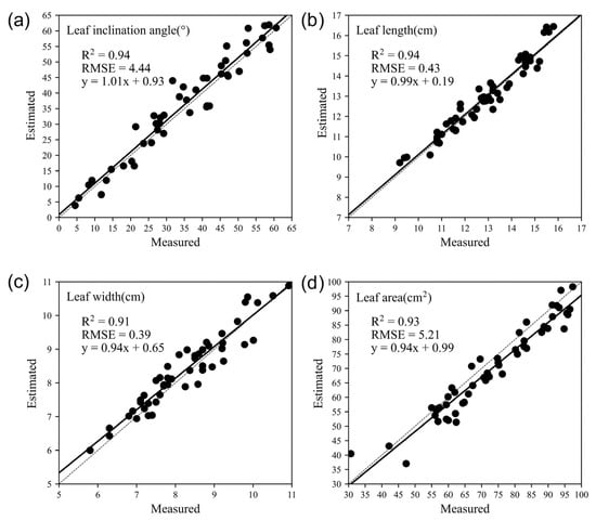 Comparison of phenotypic parameters estimated by the proposed method with the measured values: (a) leaf inclination angle; (b) leaf length; (c) leaf width; and (d) leaf area.