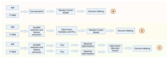 Mid-level fusion, also known as feature-level fusion, first extracts feature information from each data source, and then analyzes and processes the feature information of each part in tandem, usually using principal component analysis (PCA) or partial least squares discriminant analysis (PLS-DA) []. The advantages are that it reduces the amount of data, eliminates irrelevant variables, and improves the computational efficiency, so in most cases, the fusion effect is better than the low-level data fusion [], which is also the most used fusion method in data fusion strategies. Mid-level fusion feature information should be considered when dealing with data information of high complexity to reduce variables and shorten the calculation time. The mid-level fusion technique is also commonly used in the quality evaluation and origin traceability of food products [,], where spectroscopy and mass spectrometry data are fused for analysis [].