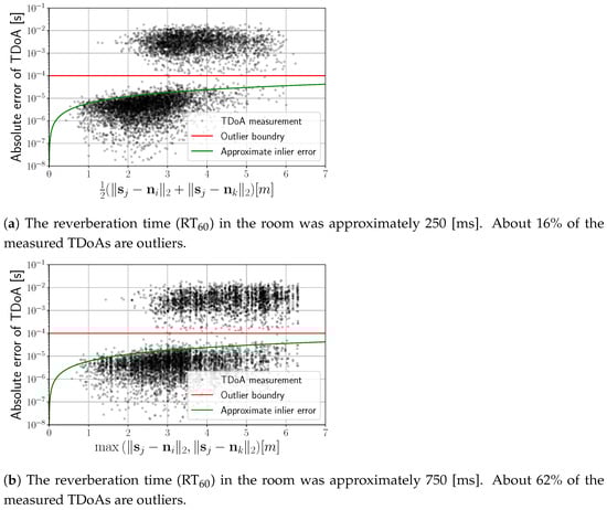 The main disadvantage of the LS estimator given by (9) is its high sensitivity to outliers in the TDoA measurement set. As a result, the solution given by (11) will usually be significantly deteriorated by outliers, which can reduce the performance of the estimator in practical deployment in reverberant rooms. As mentioned earlier, the probability of the occurrence of outliers substantially increases when the distance between the source and one of the microphones exceeds a certain threshold value. Unfortunately, since we only operate on the relative distances, and conditions of the acoustical scene are usually also unknown, in this work, we do not exploit this prior, as proposed with the heteroscedastic measurement in Section 3.1.