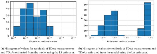 The second interesting property of the LA estimator is that its solution could be exploited for the detection of outliers. To investigate this property, we analyze the distribution of residuals for the LA solution and compare it with the distribution of residuals for the LS solution, when the TDoA measurements contain outliers. The histograms of the residuals of the TDoA measurements for both solutions are presented in Figure 3, e.g., a simulated distributed scenario. As can be seen in Figure 3a, the residuals of the solution for the LS estimator yield a distribution that is strongly concentrated around some mean value, and the shape of the distribution resembles the Gaussian distribution. The characteristic of this distribution precludes any successful analysis with the purpose of detecting outliers. On the other hand, the residual distribution of the LA estimator presented in Figure 3b exhibits a clear separation between two groups of residuals, which vary in residual value. In the following, we further investigate the relationship between the residuals for the estimated parameters and the true residuals for the ground-truth parameters. These example relationships are presented in Figure 4. Based on the value of the true residual, we can reliably distinguish which measurement belongs to the outliers, i.e., a measurement with a true residual value greater than 1 × 10−4 , and which one belongs to the inliers, i.e., a measurement with a true residual value lower than 1 × 10−4 . If we closely analyze Figure 4a, then there is a substantial separation distance between the residual of outliers and the residuals of inliers on the true residual axis for both LA and LS estimators, which we expected. In the case of the LA estimator, the substantial separation distance can be observed as well for the estimated residual axis that correctly separates outliers from inliers. Furthermore, the residual values of the estimated parameters are much more correlated with the values of the true residuals, as their distribution is more concentrated around the oracle estimator line, cf. Figure 4.