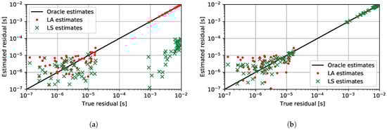 Comparison of the residual distribution for the scaling factor and synchronization offset parameters obtained by different estimators. Each individual point on the graphs represents the residual between the measured value and the TDoA value estimated by the parametric model. The axis denoted as the true residual represents the value of the residual for the ground truth parameters. Axis denoted as the estimated residual represents the value of the residual for the estimated parameters. The residuals for the oracle estimator would be on the black line. Points above the black line are overestimated. On the other hand, points under the black line are underestimated. Red dots denote the residuals that resulted from the LA estimation and green crosses denote the residuals that resulted from the LS estimation. (a) Comparison of residuals for LA and LS estimation methods without any weighting, i.e., all weights were set to 1. (b) Comparison of residuals for the LA and LS estimation methods after five iterations of the proposed reweighing method with binary weights.