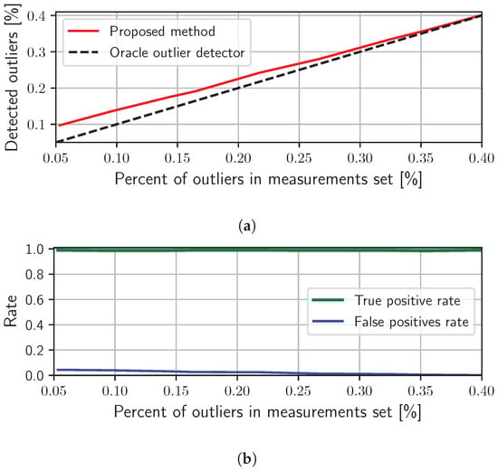 Evaluation of the proposed method in the context of outlier detection for a controlled number of outliers in the TDoA measurements set. (a) Presents the dependency between the number of outliers in the measurements and the number of outliers detected with the proposed method. (b) Shows the rates of correctly detected outliers (true positive rate) and the rates of incorrectly marked inliers as outliers (false positive rate) by the proposed method.