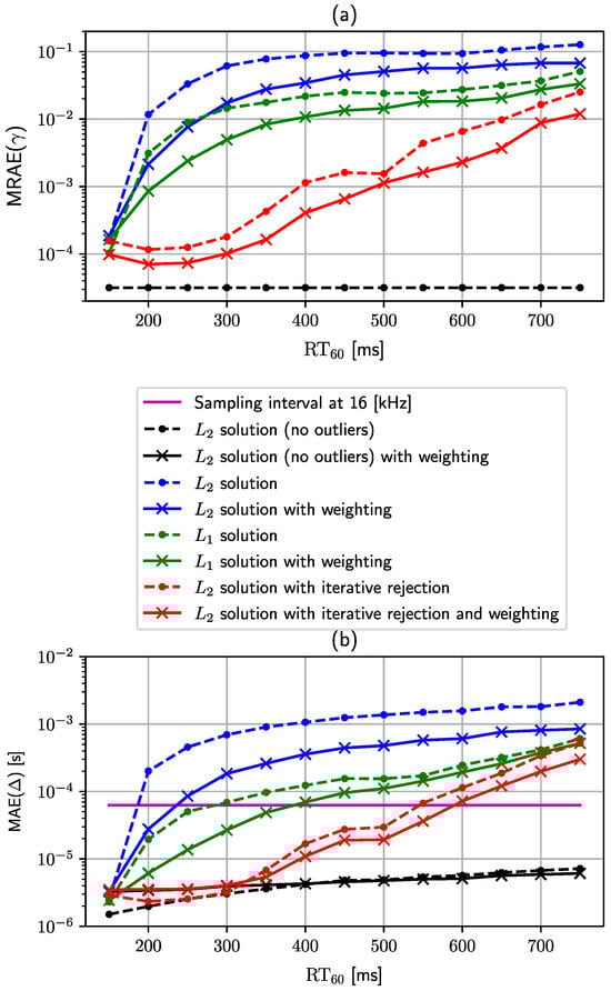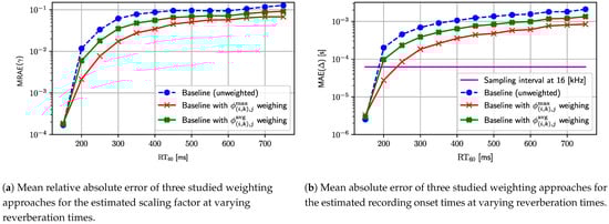 The second experiment evaluates the proposed weighting schemes that improve the estimation of the scaling factor and recording onset times when TDoA measurements are heteroscedastic due to the presence of the reverberation phenomenon. In Section 3.1, we propose the weighting scheme based on one of two types of distances, namely the maximum distance given by (12), and the average distance given by (13). To carry out the experiment, we use the solution given by (11) to solve problem (6) with the two weighting schemes mentioned above and an unweighted version (i.e., no weighting is achieved by setting ), which can be considered equivalent to the baseline approach [29]. Parameter in (14) is set to the value of 5 for this and all subsequent experiments. The evaluation is carried out for the reverberation time ranging from 150 to 750 ms with a 50 ms interval step. In order to quantitatively compare the aforementioned three different weighting options, we propose to apply two metrics, namely the mean relative absolute error (MRAE) and mean absolute error (MAE). The MRAE metric is used to evaluate the quality of the estimated scaling factor and is given by