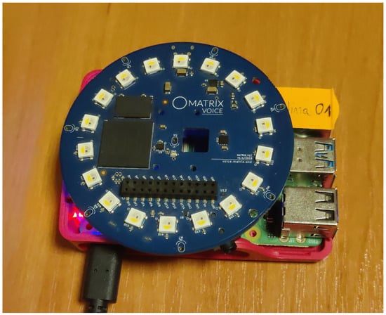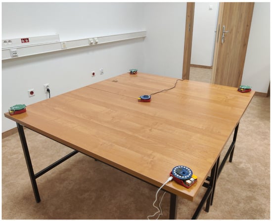 As the final experiment, an evaluation was performed using acoustic signals measured using real distributed microphone arrays connected by a wireless network in the real Audio Lab room at the premises of AGH University of Krakow (the setup is shown in Figure 8). In experiment 5, we use five circular microphone arrays, each containing eight microphones, mounted on a single-board computer with a Wi-Fi interface, as depicted in Figure 9.