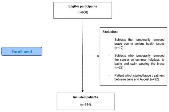 Our research involved a sample that initially comprised 638 eligible participants. These individuals were carefully selected based on our inclusion criteria, which were designed to ensure the relevance and reliability of this study’s results. As part of our data selection process, we excluded 92 participants who had commenced their treatment during the period between June and August. Additionally, 10 participants were excluded because they temporarily removed their braces, while 22 were excluded for removing the sensor. After these exclusions, our study ultimately focused on a cohort of 514 adolescents. The selection process is presented in Figure 1, while sample demographic and clinical characteristics are reported in Table 1.