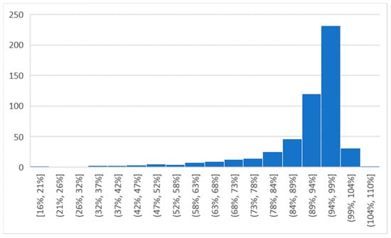Distribution of adherence within the studied population. The number of patients per adherence rate classes, measured as a percentage between the brace hours reported in the medical prescription and the mean brace-wearing hours recorded by iButton, is reported.