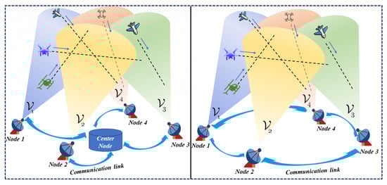 The fusion estimation of multiple sensors can be divided into two types, centralized fusion and distributed fusion, as shown in Figure 1 []. The robustness and flexibility of distributed fusion offer several advantages. Distributed fusion sensors have a low data communication link bandwidth, allowing the efficient transmission of information. Additionally, the scalability of these sensors is excellent, making them adaptable to varying needs. Moreover, distributed fusion enables the acquisition of an optimal fusion algorithm when the correlation conditions are known. It is widely used in multi-sensor and multi-target tracking [,,,,,]. Scholars have conducted in-depth research on multi-sensor distributed fusion strategies. For example, Yu [] suggested a method for distributed fusion filtering based on dynamic communication weights to tackle the issue of fusion errors in incomplete node information within distributed sensor networks. The proposed method aims to improve the situation by optimizing the fusion process in a finite time manner. Senel [] conducted research and analysis in the fields of multi-sensor data fusion and real-time multi-target tracking. Liu [] proposed a distributed sequential ellipsoidal intersection fusion estimation algorithm. This algorithm combines the local filter estimates obtained at the fusion center in order to achieve more precise fusion localization results. Additionally, it achieves this objective with reduced computational costs. Su [] proposed an improved adaptive birth model based on pre-segmentation measurement in his research, which solves the problems of measurement origin uncertainty and cardinality overestimation in the distributed fusion of sensor networks. Pal [] proposed a distributed fusion underwater wireless sensor network using local tracker optimal quantization estimation in his research.