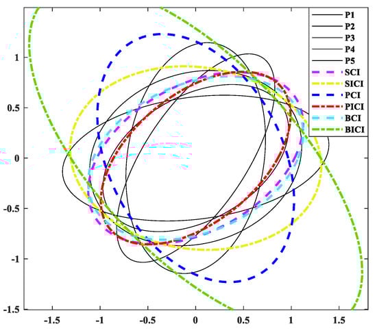 In order to validate the effectiveness of the PICI fusion algorithm, this study chose an L value of 5 and conducted a comparative analysis on the effects of SCI, SICI, PCI, PICI, BCI, and BICI through covariance ellipse validation. The results of the comparison of various covariance intersection fusion algorithms can be seen in Figure 4. From this, it can be seen that the PICI fusion algorithm has higher fusion accuracy than other algorithms.