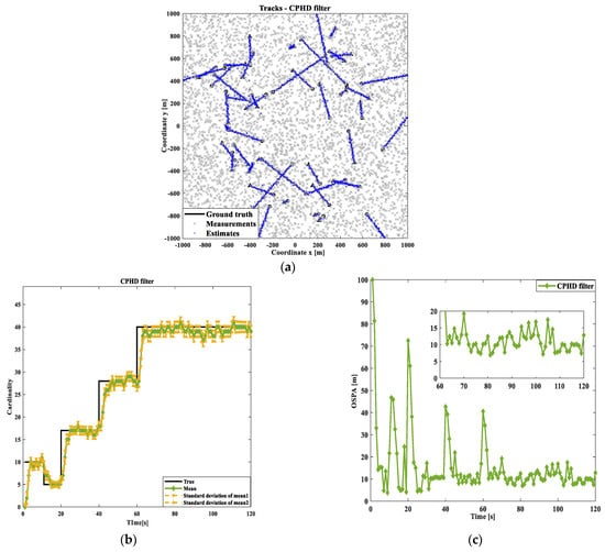 Comparison of PHD filtering results: (a) target tracking path result; (b) cardinal distribution results; (c) OSPA error results.