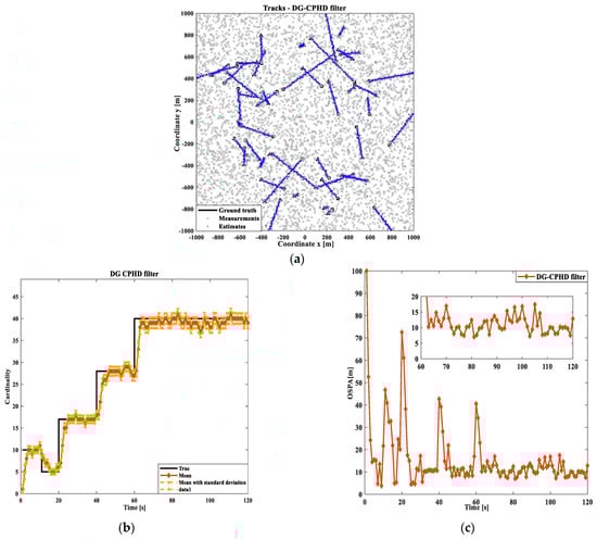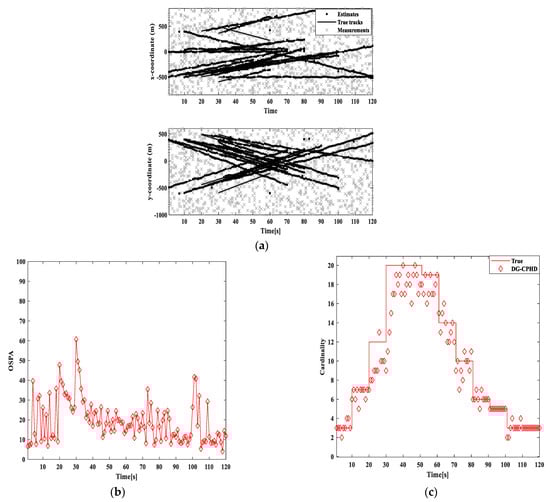 Comparison of GM-DG-CPHD filtering results: (a) target tracking path result; (b) cardinal distribution results; (c) OSPA error results.