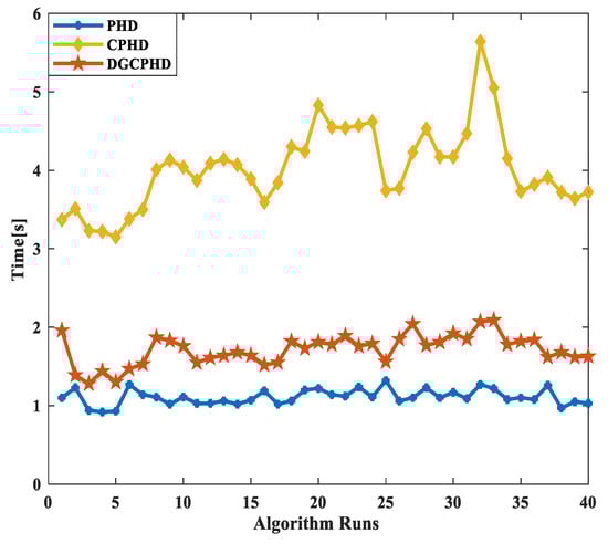 Next, the running times of the PHD, CPHD, and DG-CPHD filtering methods are compared, and 40 algorithm runs are selected for comparison, as shown in Figure 8. The above comparison results suggest that the DG-CPHD filtering effect is similar to the CPHD filtering effect, but the calculation time can be significantly shorter than the CPHD filtering operation time. It can be seen that the DG-CPHD filter can be widely used in systems with high requirements for the calculation time and low requirements for the filtering effect. From the running time of the three filtering methods shown in Figure 8, CPHD has the longest filtering time, PHD has the shortest filtering time, and DG-CPHD has a running time between the two. In other words, from the perspective of the filtering effect, .