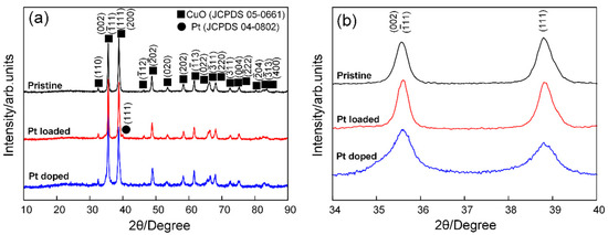 (a) XRD patterns of pristine CuO, 2 mol% Pt-CuO, and 2 mol% Pt@CuO; (b) magnified region of three main CuO diffraction peaks.