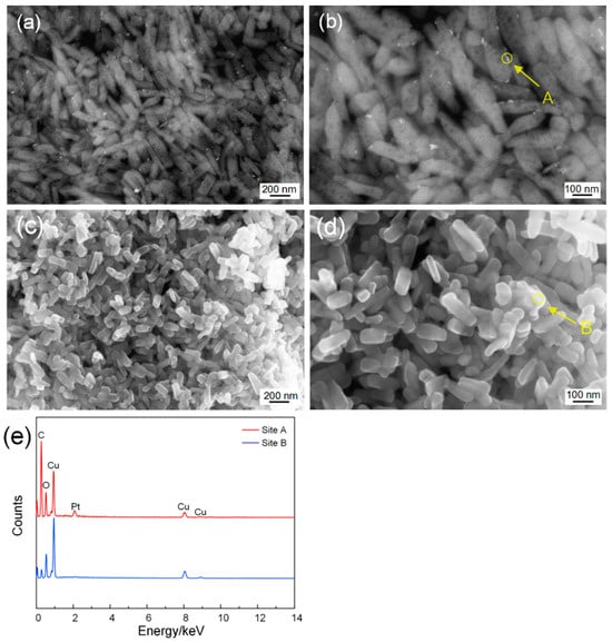 The surface morphology of 2 mol% Pt@CuO nanorods was observed with an SEM, which is shown in Figure 2a,b. After Pt loading, granular products appear on the surfaces of CuO nanorods. According to the energy spectrum of Site A in Figure 2e, it can be inferred that they are Pt nanoparticles. The surface morphology of 2 mol% Pt-CuO nanorods is shown in Figure 2c,d. By comparing them to 2 mol% Pt@CuO nanorods, it can be seen that the morphology of the CuO nanorods is changed after Pt doping, as their length is shortened to 100–150 nm, while their diameter is not affected, but no obvious noble metal particles are observed on their surfaces.