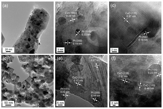 The microscopic morphologies of 2 mol% Pt@CuO nanorods and 2 mol% Pt-CuO nanorods were further investigated comparatively using a TEM. The TEM images of 2 mol% Pt@CuO nanorods are shown in Figure 3a–c, and it can be seen in Figure 3a that the morphology of the CuO nanorods did not change after Pt loading. The granular products are uniformly distributed on the surfaces of the nanorods, and most of the particles are within 10 nm in diameter, while a few particles are agglomerated together to form larger particles. From the high-magnification TEM images shown in Figure 3b,c, it is clear that these particles are Pt metal particles. The grain plane spacings of 0.25 and 0.27 nm can be attributed to the (002) and (110) crystal planes of the monoclinic structure of CuO, respectively, while the grain plane spacings of 0.19 and 0.22 nm can be ascribed to the (200) and (111) crystal planes of the cubic crystal structure of Pt, respectively. The TEM images of 2 mol% Pt-CuO nanorods are shown in Figure 3d,f, and it can be seen from Figure 3d that the morphology of CuO nanorods was changed after Pt doping, forming a state in which short nanorods and nanoparticles coexist, indicating that the growth orientation of CuO crystals becomes irregular after doping with Pt. This is also in general agreement with the XRD analysis results. The 0.17, 0.27, and 0.46 nm crystal plane spacings shown in Figure 3e,f correspond to the (112), (110), and (100) crystal planes of the monoclinic structure of CuO, while the 0.19 and 0.22 nm crystal plane spacings correspond to the (200) and (111) crystal planes of the cubic structure of Pt, respectively.
