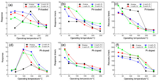 (a,d) Responses, (b,e) response times, and (c,f) recovery times of sensors based on Pt@CuO and Pt-CuO with different Pt concentrations when exposed to 5 ppm NO2 as a function of operating temperature.